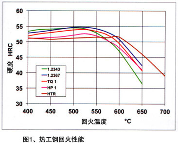 圖表不僅是壓鑄模具熱處理時一個重要的工作方法,而且也對熱工鋼正確選擇有幫助。這樣的圖表明的是由于加熱鋼的硬度變化。圖1,是所介紹鋼的回火曲線,在此曲線圖上,德國使用較少的1.2344鋼未列上去。除了HTR鋼,所列鋼種在500——550度之間回火溫度下表現有顯明的二次硬度最大值。隨著回火溫度繼續增加,硬度下降。由曲線下降坡度可以推斷回火穩定性?;鼗鹎€下降越陡,鋼的回火穩定性越小,在澆注作業中鋼的加熱反應越敏感。與1.2343鋼相比,此曲線證明1.2367鋼有較好的回火穩定性,在550度之上回火溫度技術范圍,TQ1和HP1達到幾乎與1.2367一樣的回火穩定性。特種鋼HTR由于其高的鎢含量表現出較其余鋼明顯高的回火溫度。二次硬度最大值不僅在約70度時移至較高的回火溫度,在此最大值之上溫度時曲線也降得比較小。