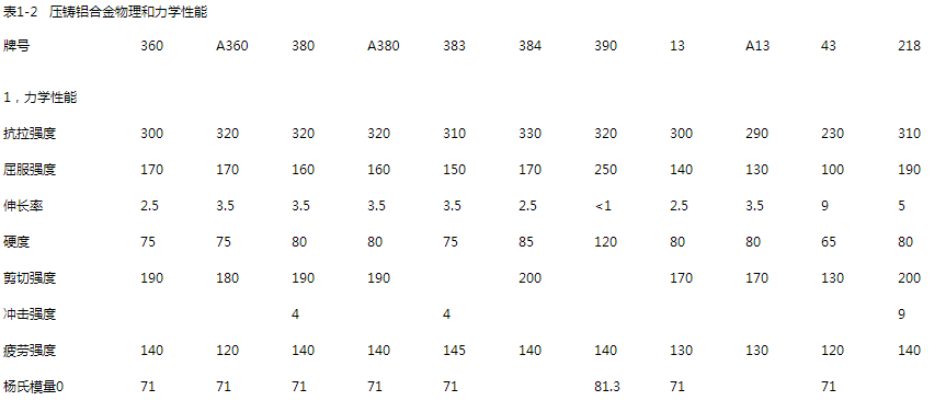 表1-2介紹了壓鑄鋁合金的物理和力學性能,可供設計產品時作滿足其技術要求、使用要求的選擇